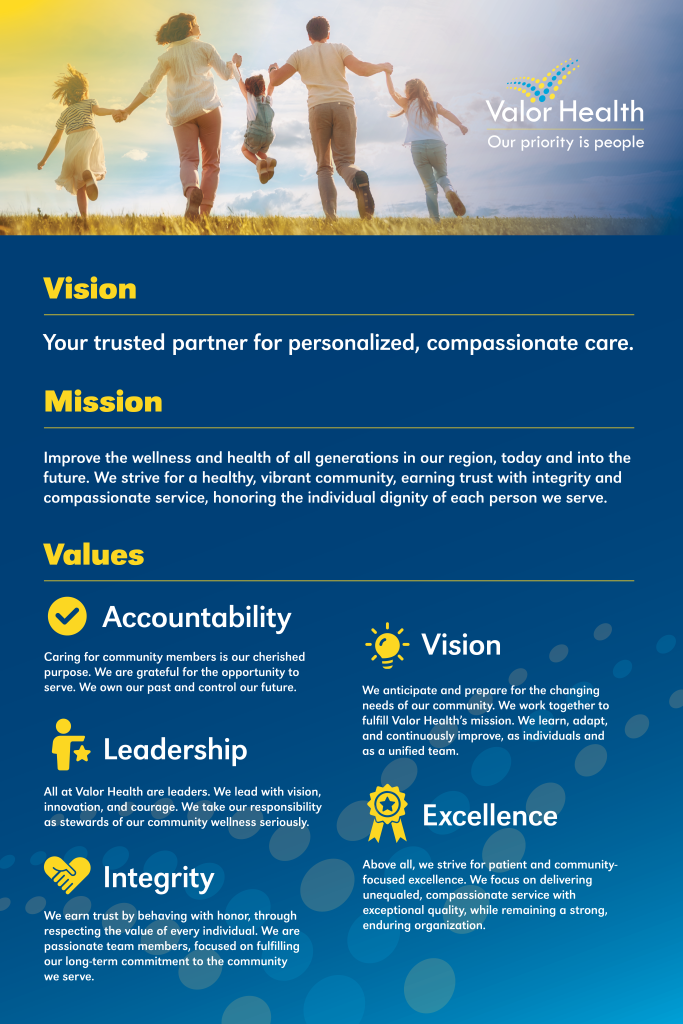 Valor Health’s mission, which guides our efforts, remains to improve the wellness and health of all generations in our region today and into the future. We strive for a healthy, vibrant community, earning trust with integrity and compassionate service, honoring the dignity of each person we serve.